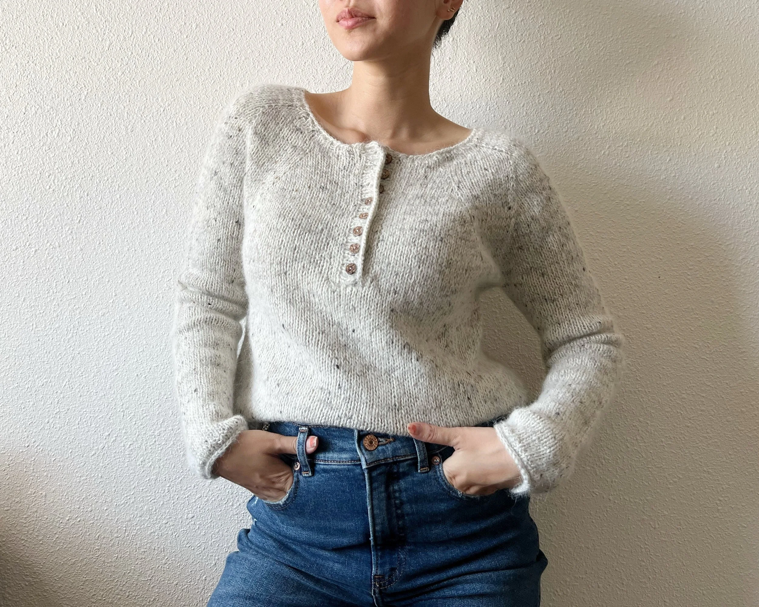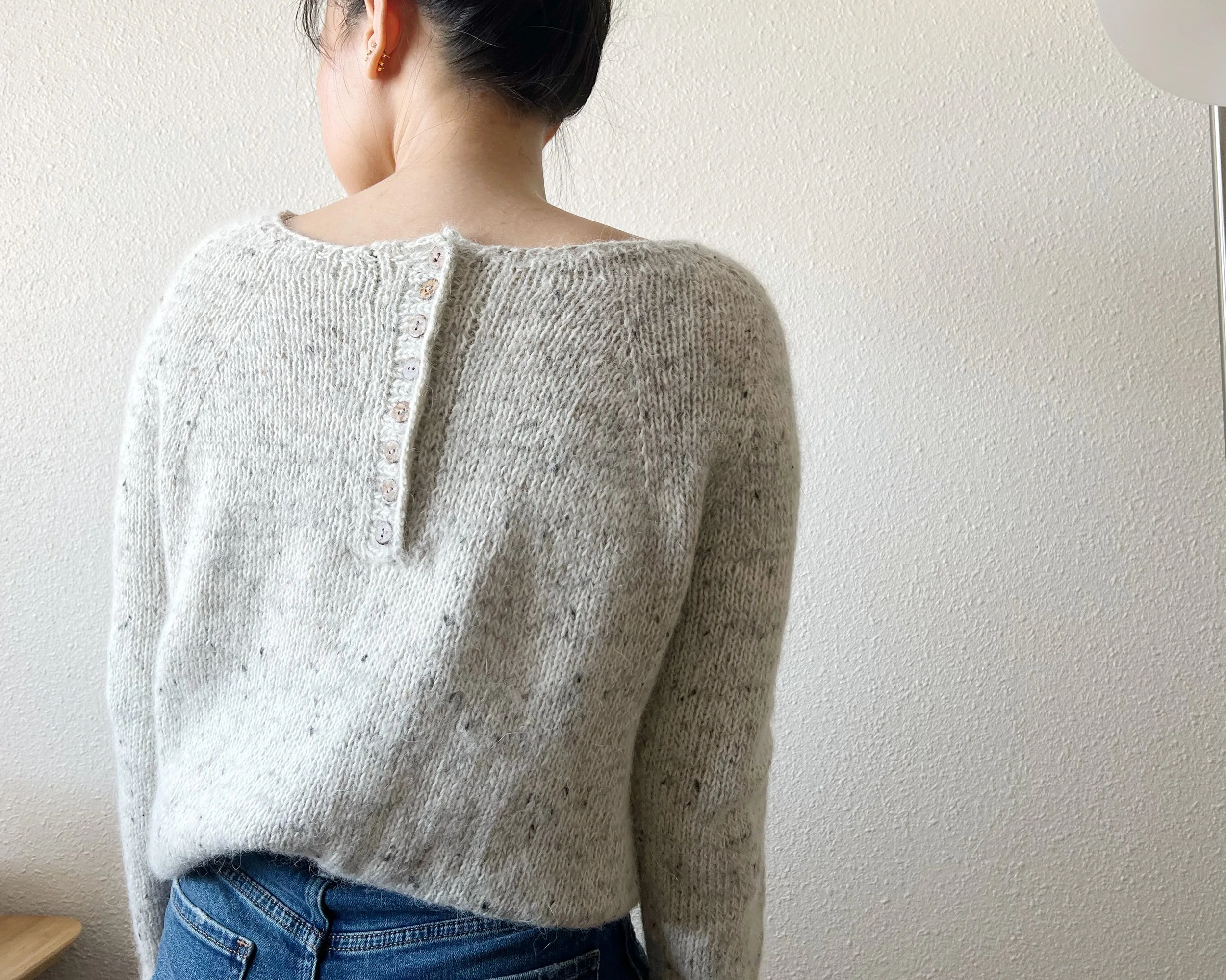 Soft and versatile, but in a pullover form. Introducing the Emme Pullover with a slight boat neck and henley style button on the back! (or front if you wear it backwards :) ). Since there is a shoulder shaping built into the pattern, you can actually wear the Emme Pullover on either side, hence making it reversible!
