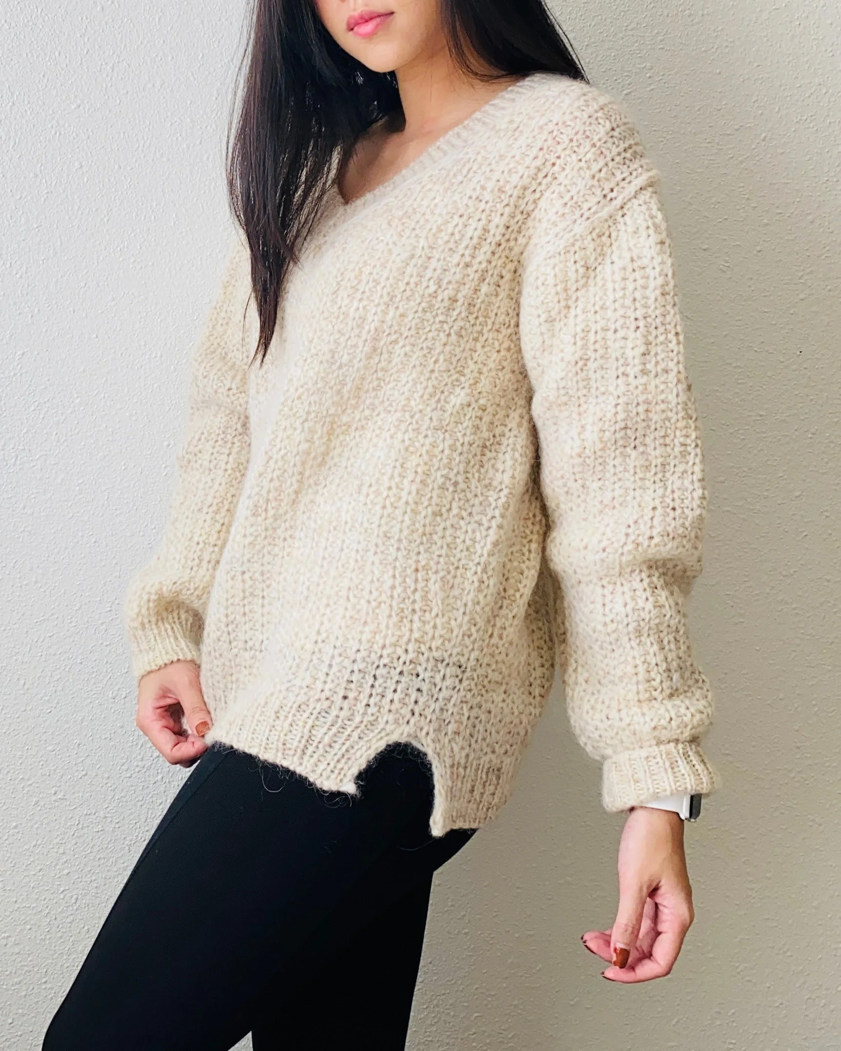Keeping similar design elements of the Walpole Pullover, the V-neck version is a simple, yet classic design featuring the wide V-neck with the exposed seam on the back, armholes, and necklines as well as the hi-low split hems to give a playful and modern look. It is an oversized sweater that gives the cozy feel while still looking luxurious. Walpole Pullover will be a perfect addition to your closet.